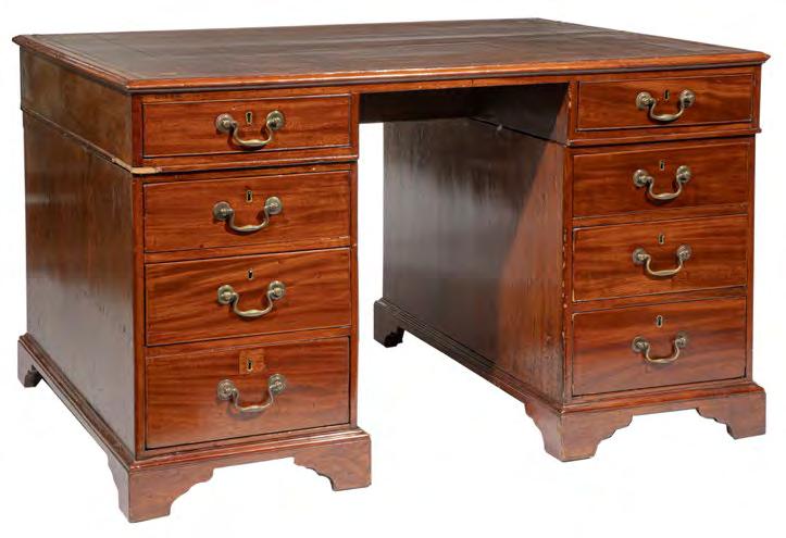 9. Georgian Mahogany Partners Desk, 19th c., tooled leather top, one side with three frieze drawers over banks of drawers, plinth base, casters, h. 30 3/4 in., w. 66 in., d. 41 in. [$700/1000]