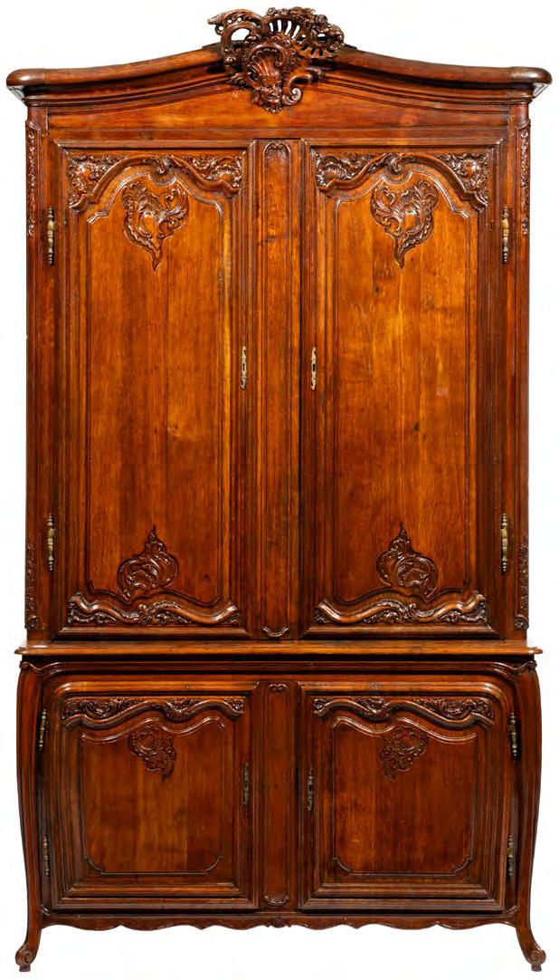 40. French Provincial Carved Walnut Armoire, 18th c., molded cornice, floral carved frieze, molded shaped paneled doors, molded scalloped apron, cabriole legs, belt of drawers, h. 103 in., w. 61 1/2 in., d. 25 1/4 in. [$1000/1500]