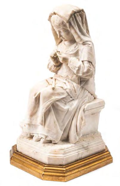55. Marble Figure of a Seated Woman, after Pietro Magni, cast signature and date “Pietro Magni 1873” proper right, h. 21 in., w. 10 1/2 in., d. 11 in., carved giltwood base, overall h. 23 in. [$1000/2000]