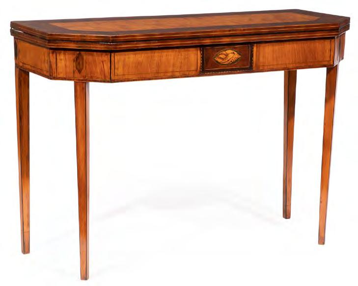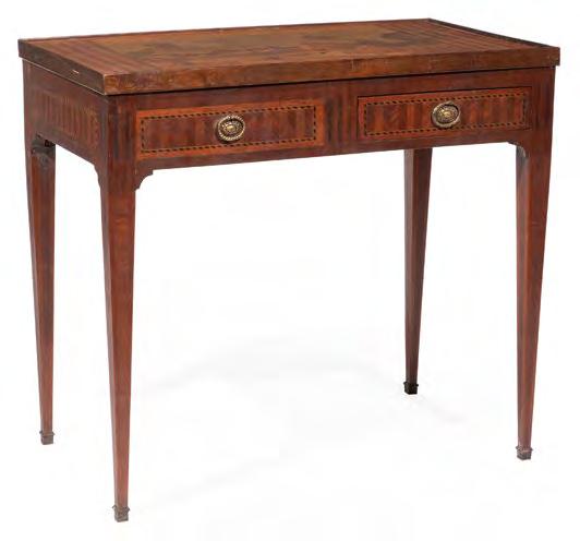 lift top with gameboard on one side and marquetry on verso, frieze drawer, square tapered legs, h. 30 1/2 in., w. 33 1/2 in., d. 19 3/4 in.