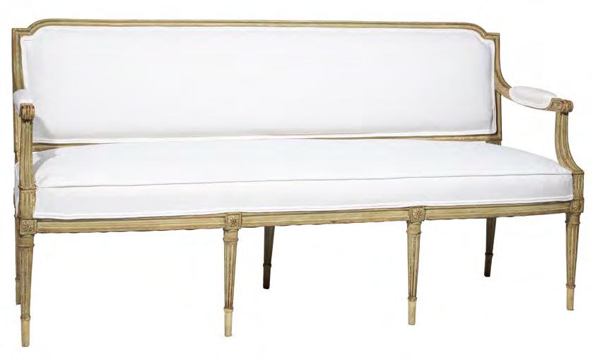 38. Louis XVI-Style Creme Peinte Settee, 19th c., shaped molded crest rail, scrolled padded arms, conforming seat rail, stop fluted tapered legs, h. 35 1/2 in., w. 71 in., d. 23 in. [$800/1200]