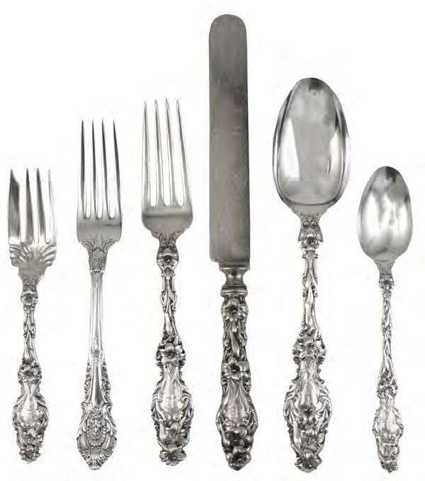 48. Whiting “Lily” Pattern Sterling Silver Flatware Service, pat. 1902, incl. 12 each: forks (l. 7 5/8 in.), knives (l. 9 3/4 in.) and fruit spoons; 8 forks (l. 6 7/8 in.), 22 salad forks and 2 tablespoons, monogrammed; together with 2 Wallace “Rose Point” forks (l. 7 1/4 in.); total wt. (weighable) 86.95 troy ozs. (62 pcs.) [$2000/3000]