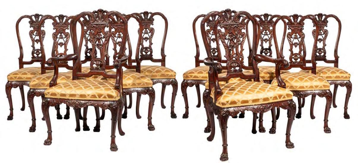 3. Fine Set of Twelve Chippendale-Style Carved Walnut Dining Chairs, mid-19th c., incl. two arms, ten sides, molded crest rail centered by Prince of Wales plumes, pierced carved splat, scrolled arms, shell carved seat rail, cabriole legs, paw feet, armchair h. 43 1/4 in., w. 26 in., d. 22 1/4 in., side chair h. 41 1/4 in., w. 22 1/2 in., d. 19 1/4 in. [$7000/10000]