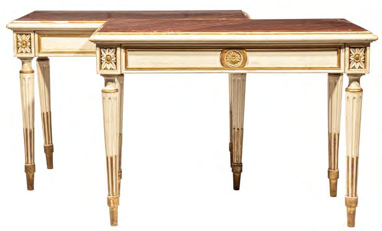 22. Venetian Rococo-Style Parcel Gilt and Painted Console, late 19th c., molded marble top, molded frieze drawer, C scroll corners, cabriole legs, scrolled toes, h. 36 1/4 in., w. 54 in., d. 23 in.
