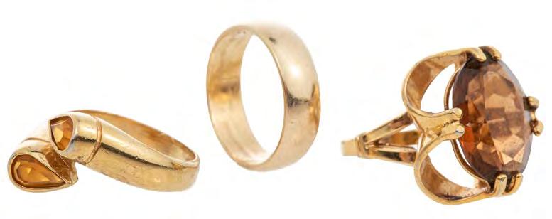 20. Three 14 kt. Yellow Gold & Gemstone Rings, marked, incl. ribbon design with oval mixed cut gemstone, size 8.25; “Toi et Moi” with pear shape gemstones, size 8.5; and band, size 8; 11.80 dwts. [$500/700]
