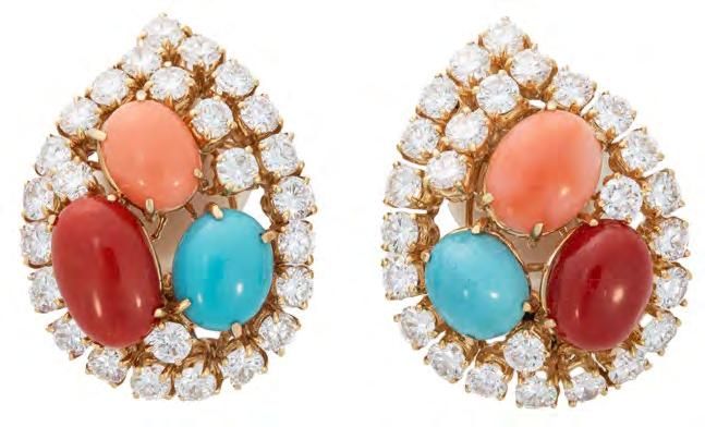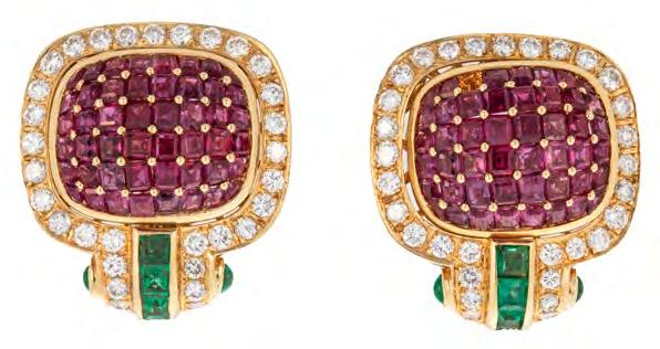 35. Italian 18 kt. Yellow Gold, Diamond, Ruby, and Emerald Earrings, clip backings, l. 1 in.; 14.89 dwts. , l. 1 in [$8,000/12,000]