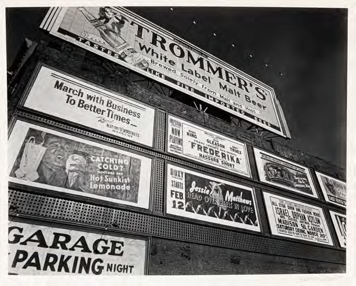 686. Berenice Abbott (American, 1898-1991), “Advertisements, East Houston Street and 2nd Ave.”, negative creation date 1937, print date 1982, gelatin silver print mounted on board, pencil-signed and numbered “13/40” on mount, published by Parasol Press, New York, “Berenice Abbott Retrospective” stamp with publisher information and print date on reverse of mount, 18 1/4 in. x 23 1/8 in., unframed. [$1200/1800]