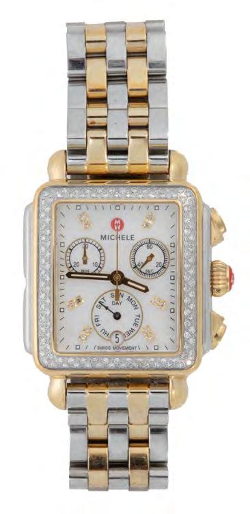 3. Michele Deco Diamond Stainless and 18K Gold-Plated Watch, chronograph, quartz movement, bezel set with 120 diamonds (0.6 carats), 35mm, sapphire crystal, mother-of-pearl dial, bracelet with butterfly clasp, water resistant to 5 atm.