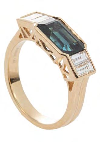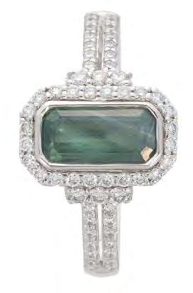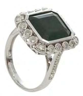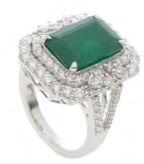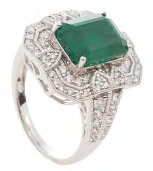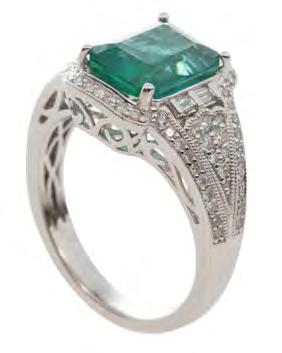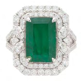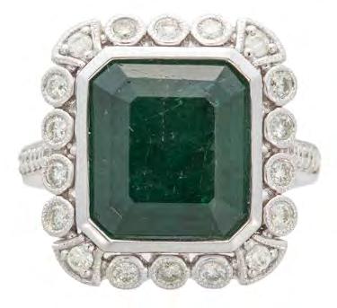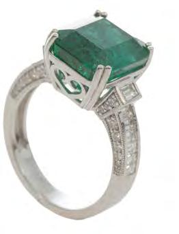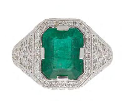 46. 14 kt. White Gold, Emerald and Diamond Ring, center octagonal step faceted cut emerald, wt. approx. 6.61 cts.; bezel and shoulders set with 18 round brilliant cut diamonds, total wt. approx. 0.59 cts.; size 6.75; GGA report. [$3000/5000]