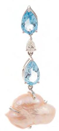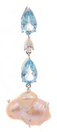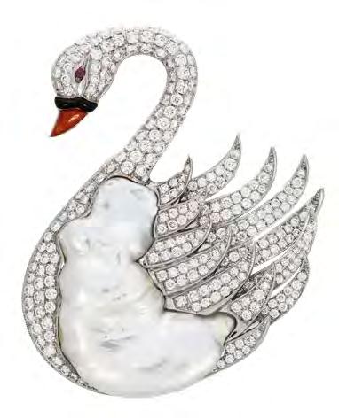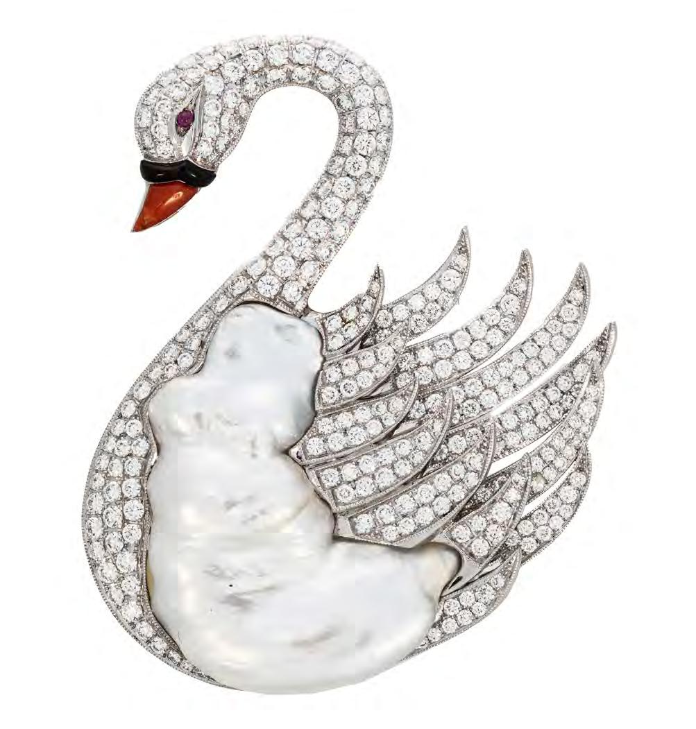 61. Verdura Style 18 kt. White Gold and, Baroque Pearl, Diamond, Coral and Ruby Swan Brooch, center baroque pearl, wt. approx. 59.78 cts.; neck and feathers mounted with numerous round diamonds, total wt. approx. 7.10 cts.; l. 2 3/4 in.; 29.24 dwts.
