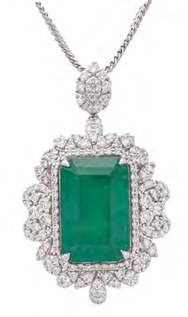 51. Platinum, Emerald and Diamond Pendant on Chain, center octagonal step cut emerald, wt. approx. 15.38 cts.; ornate bezel and bale set with 139 round brilliant cut diamonds, total wt. approx. 1.99 cts., G-H color, VS2-SI1 clarity; pendant l. 1 5/8 in.; chain l. 18 in.; AIGL report. [$10,000/12,000]
