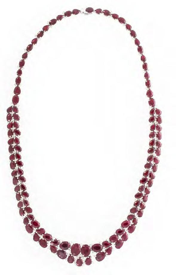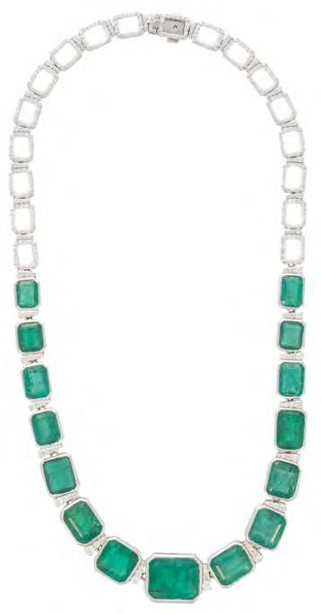 55. 18 kt. White Gold, Emerald and Diamond Necklace, mounted with 15 graduated emerald faceted cut emeralds, total wt. approx. 81.39 cts.; and 426 round brilliant cut diamonds, total wt. approx. 5.82 cts., G-H color, SI2-I1 clarity; l. 17 1/4 in.; GGA report. [$30,000/40,000]