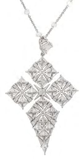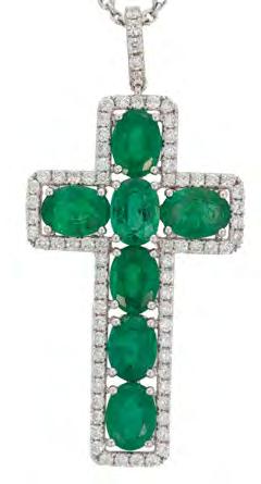 52. 18 kt. White Gold, Zambian Emerald and Diamond Cross Pendant on Chain, mounted with 7 oval Zambian emeralds, total wt. approx. 6.02 cts.; and numerous round diamonds, total wt. approx. 1.01 cts.; pendant l. 1 1/2 in.; chain l. 18 in.; 7.05 dwts. [$12,000/18,000]