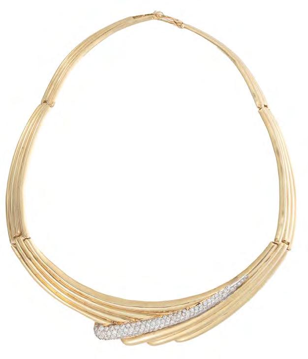 27. Vintage 14 kt. Yellow Gold and Diamond Swirl Collar Necklace, marked, mounted with numerous round diamonds, total wt. approx. 2.00 cts.; l. approx. 14 in.; 48.00 dwts. [$5000/7000]