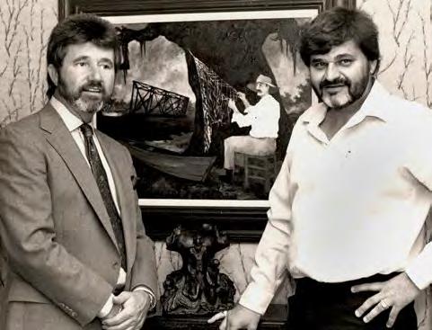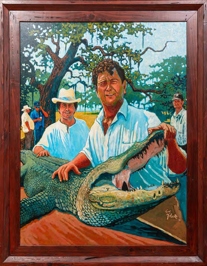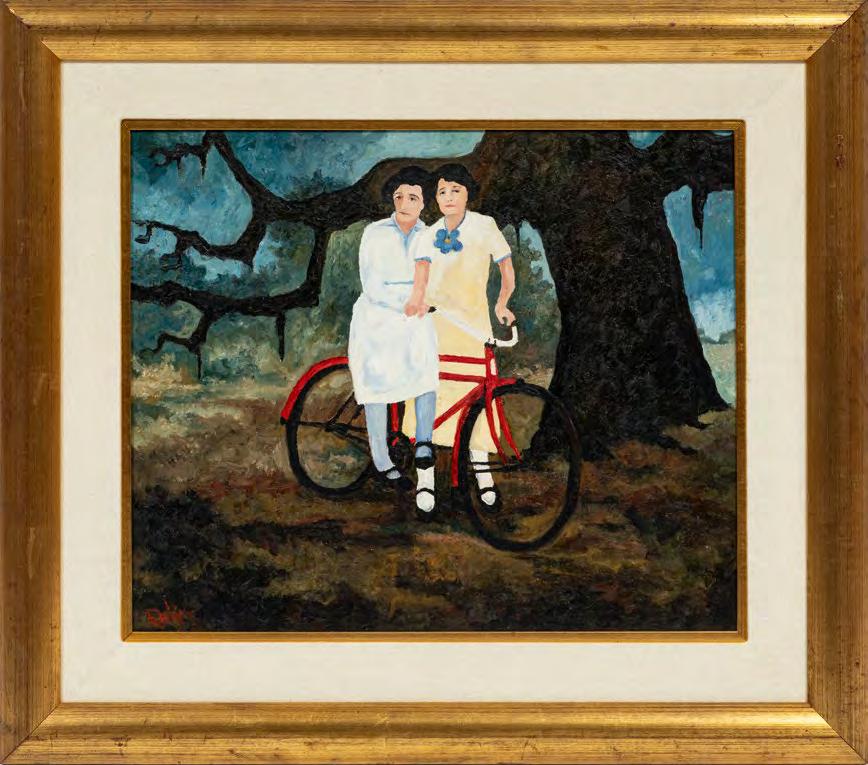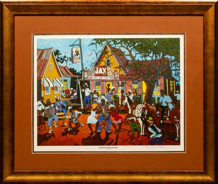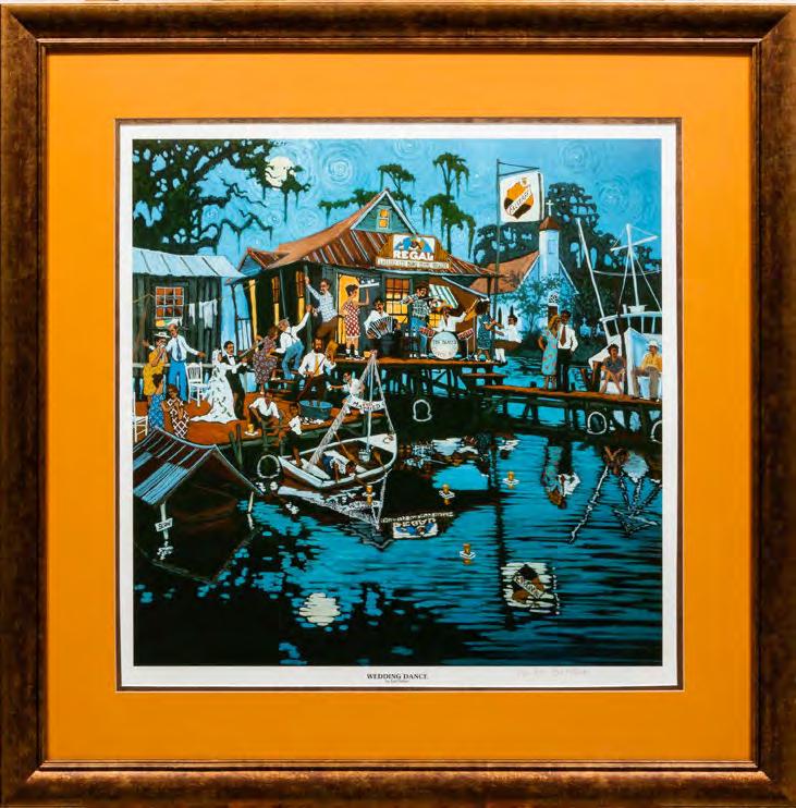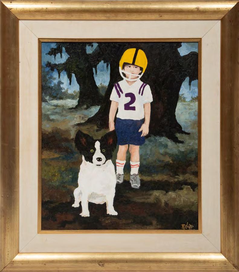 Mr. Bates met George Rodrigue in the 1980s and was moved by Mr. Rodrigue’s heart-centered interpretations of Louisiana life and culture. Mr. Rodrigue would drive to Texas to sell art from the trunk of his car at that time, and since Mr. Bates lived right across the border in Orange, Texas, he was often Mr. Rodrigue’s first stop. Mr. Rodrigue ate soup with the Bates family on his Texas trunk sale stops and also enjoyed a stay in the family’s Gulf Coast beach home a time or two.