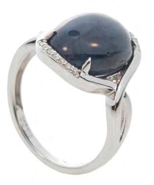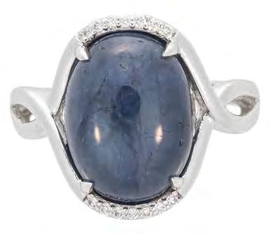 11. 14 kt. White Gold, Blue Star Sapphire and Diamond Ring, center oval cabochon blue star sapphire, wt. approx. 9.39 cts.; accented with round brilliant cut diamonds, total wt. approx. 0.07 ct.; size 7; IAS report. [$1000/1500]
