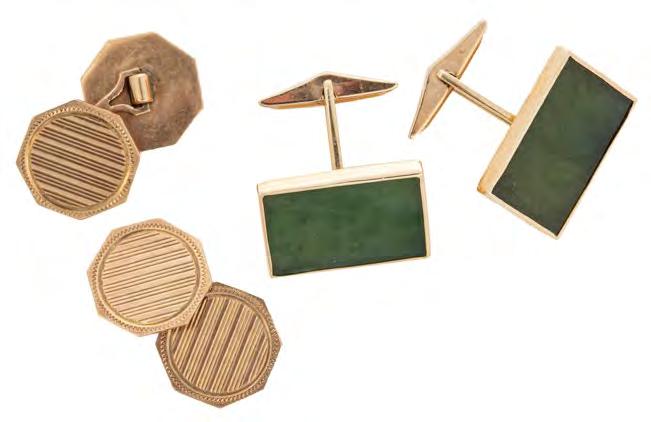1. Two Pairs of Gold and Jade Cufflinks, incl. pair of 14 kt. yellow gold and jade cufflinks, marked “GUMP’S”, 6.78 dwts.; and pair of 9 kt. gold cufflinks, 3.77 dwts. [$200/300]