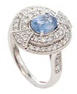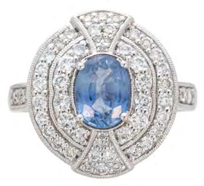 13. Art Deco Style Platinum, Sapphire and Diamond Ring, center GIA certified oval mixed cut blue sapphire, wt. approx. 1.28 cts.; bezel with 56 round brilliant cut diamonds, total wt. approx. 0.76 ct., F-G color, VS2-SI1 clarity; size 6.75; AIGL and GIA reports. [$2500/3500]