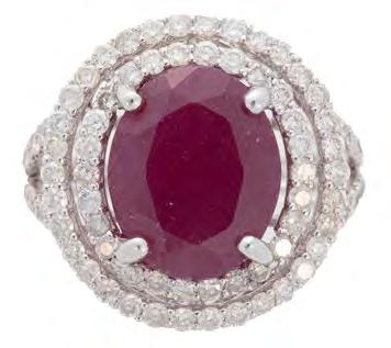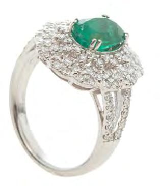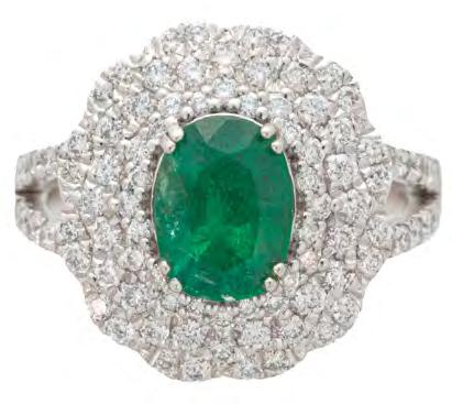 45. Platinum, Emerald and Diamond Ring, center oval mixed cut emerald, wt. approx. 1.91 cts.; triple bezel and shoulders set with 91 round brilliant cut diamonds, total wt. approx. 1.10 cts., F-G color, VS1-VS2 clarity; size 7.25; GGA report. [$3000/5000]