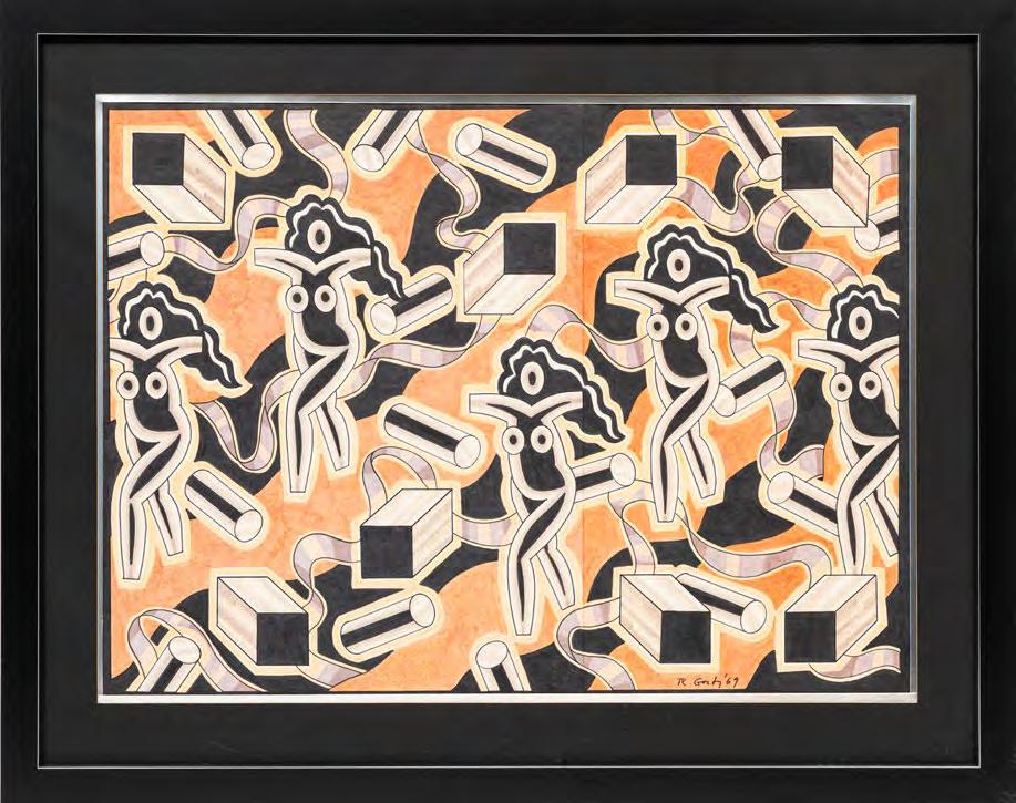 677. Robert Gordy (American/Louisiana, 1933-1986), “Study for Folly”, 1969, marker on paper, signed and dated lower right, titled en verso, 24 1/4 in. x 32 1/4 in., framed, overall 31 5/8 in. x 39 3/4 in. x 1 in.