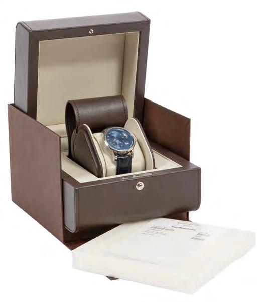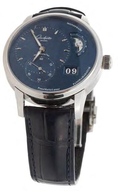 Stainless Watch, caliber 90, ref. 190024632, serial #205150, 40mm, transparent caseback, blue dial, with subsidiary seconds dial and moon phase indicator, movement with 21 carat gold oscillation weight, Glashutte Louisiana alligator strap with deployant clasp, with original box and papers. [$3000/5000]