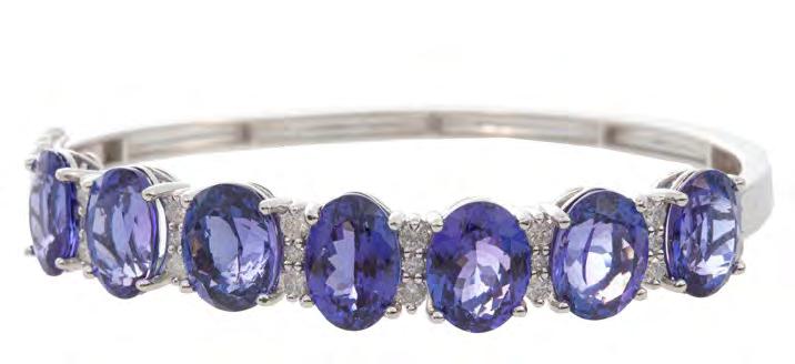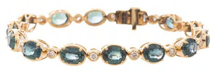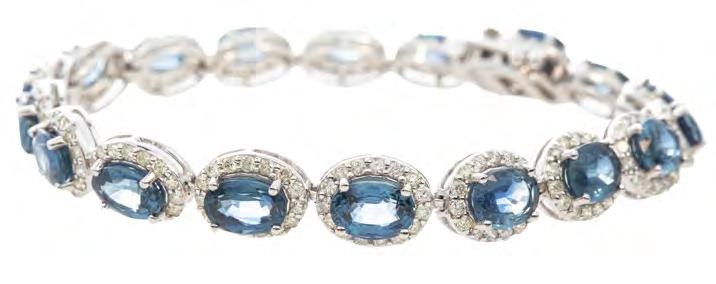 15. Platinum, Sapphire and Diamond Bracelet, mounted with 18 oval brilliant faceted cut blue sapphires, total wt. approx. 14.91 cts.; bezels with 252 round brilliant cut diamonds, total wt. approx. 2.62 cts., G-H color, SI1-SI2 clarity; l. 6 1/2 in.; GGA report. [$4000/6000]