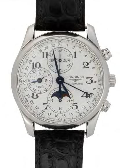 2. Longines Master Collection Chronograph Moonphase Stainless Watch, caliber L687, ref. L26734, 40mm, serial #47209000, sapphire crystal, transparent caseback, automatic, leather strap, original box and instructions [$700/1000]