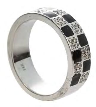 63. 14 kt. White Gold, Diamond and Black Enamel Checkered Ring, set with numerous diamonds, total wt. approx. 0.30 ct.; size 6.25; GGA report. [$1000/1500]