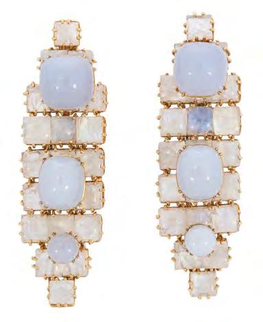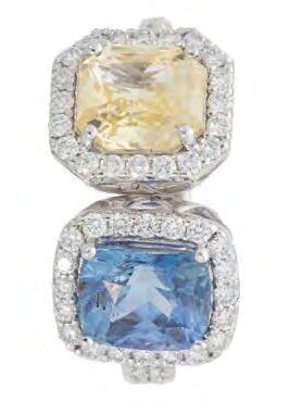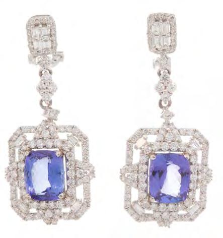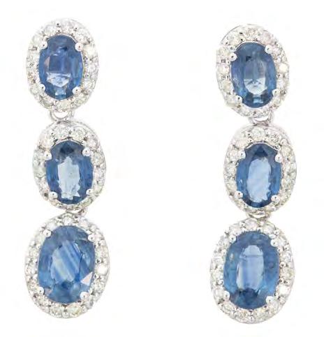 14. 14 kt. White Gold, Sapphire and Diamond Dangle Earrings , mounted with 6 oval brilliant faceted cut blue sapphires, total wt. approx. 4.12 cts.; bezels set with 82 round brilliant cut diamonds, total wt. approx. 0.78 cts.; l. 1 in.; GGAreport. [$1800/2500]