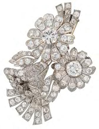 58. 18 kt. White Gold and Diamond Floral Brooch, set with numerous round diamonds, total wt. approx. 7.36 cts.; l. 2 1/4 in.; 13.85 dwts.