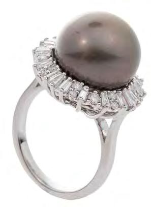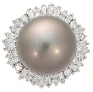 8. Platinum South Sea Pearl and Diamond Ring, center dark gray or aubergine cultured south sea pearl, 13.90-14,10 mm; bezel with 40 round brilliant and baguette cut diamonds, total wt. approx. 1.14 cts.; size 7; GGA report. [$3000/5000]