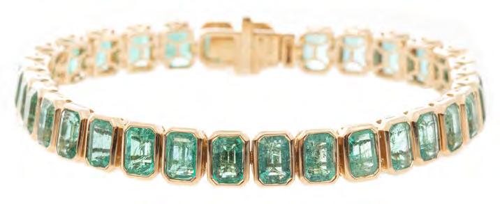 37. 14 kt. Yellow Gold and Emerald Line Bracelet, mounted with 32 octagonal step faceted cut emeralds, total wt. approx. 19.31 cts.; l. 6 3/4 in.; GGA report., l. 6 3/4 in [$7000/9000]