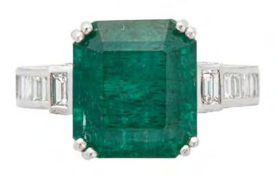 47. Platinum, Emerald and Diamond Ring, center GIA certified octagonal step faceted cut emerald, wt. approx. 7.29 cts.; shoulders set with 50 baguette and round brilliant cut diamonds, total wt. approx. 1.05 cts., F-G color, VS1-VS2 clarity; size 7; GGA and GIA reports. [$7000/9000]