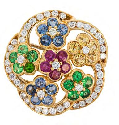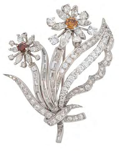 57. Platinum, Diamond and Colored Diamond Floral Brooch, mounted with numerous round, marquise and baguette cut diamonds, total wt. approx. 4.30 cts.; and 2 round colored diamonds, total wt. approx. 0.45 cts.; l. 2 in.; 13.46 dwts.