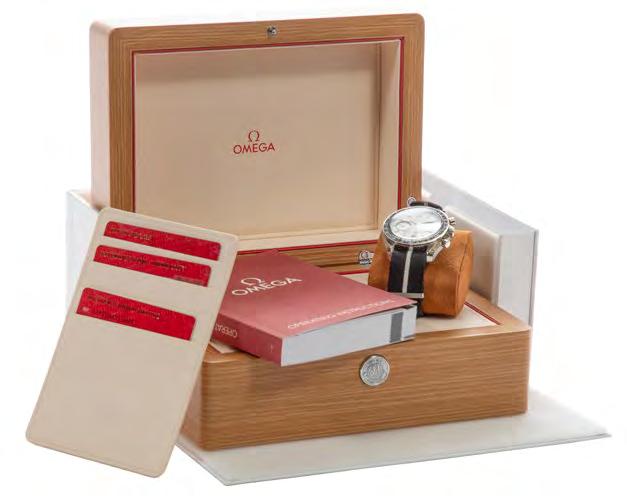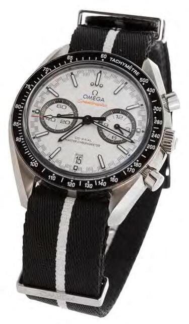 5. Omega Speedmaster Stainless Racing Chronograph Watch, caliber 9900, 44.25 mm, ref. 329.30.44.51.04.001, serial #84299037, transparent caseback, automatic, sapphire crystal, black and white stripe Nato strap, water resistant to 50 meters, with box, instructions, and cards. [$2500/3500]