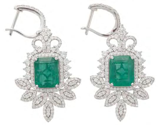 53. Platinum, Emerald and Diamond Dangle Earrings, 2 center octagonal step cut emeralds, total wt. approx. 10.09 cts.; ornate setting mounted with 336 round brilliant cut diamonds, total wt. approx. 3.27 cts., G-H color, VS1-SI1 clarity; l. 1 7/8 in.; AIGL report. [$18,000/25,000]
