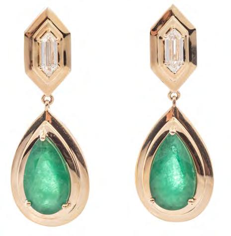 36. 14 kt. Yellow Gold, Emerald and Diamond Dangle Earrings, 2 Brazilian pear mixed cut emeralds, total wt. approx. 6.14 cts.; and 2 kite cut diamonds, total wt. approx. 0.70 ct.; l. 1 1/2 in.; GGA report., l. 1 1/2 in [$6000/8000]