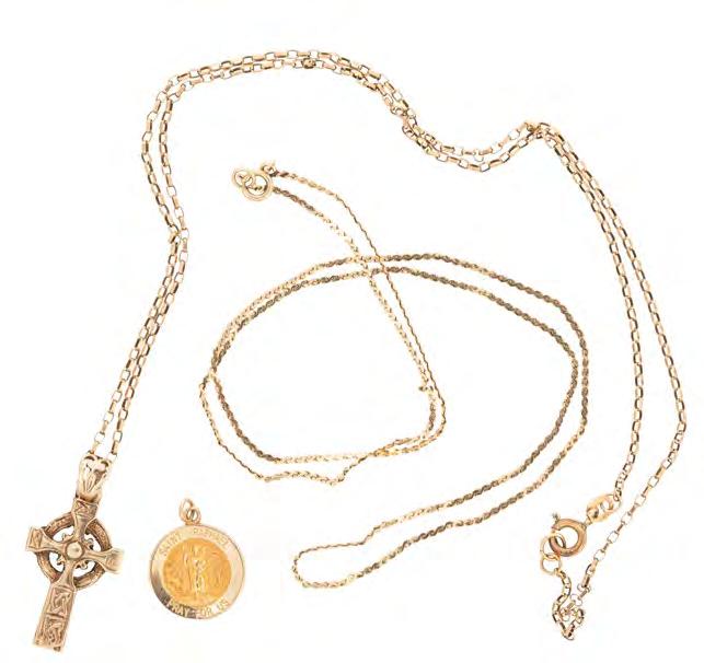 17. Group of 14 kt. Yellow Gold Jewelry, two chains, l. 18 in.; cross, l. 1 1/4 in.; and St. Raphael coin; 5.03 dwts. [$200/300]