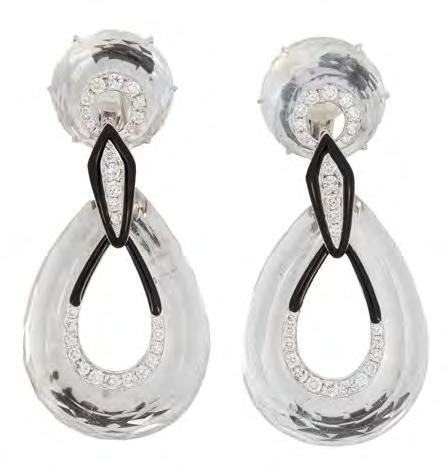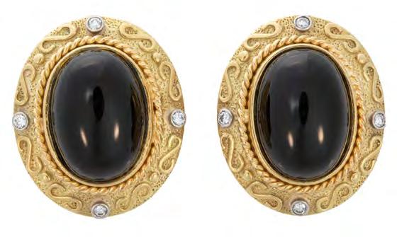 30. 18 kt. Yellow Gold, Onyx and Diamond Earrings, marked, central bezel set oval cabochon onyx, scrollwork bezels mounted with 8 round diamonds, clip backings, l. 1 in.; 20.14 dwts. [$4000/6000]