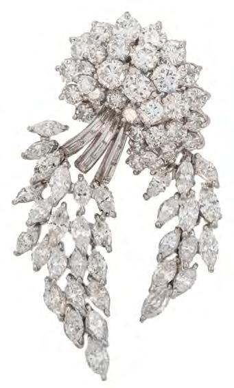 60. Platinum and Diamond Pendant Brooch, mounted with reticulated cascade of 34 marquise diamonds, total wt. approx. 4.08 cts.; 33 graduated round diamonds; and 15 invisibly set tapered baguette diamonds; l. 2 1/4 in.; 19.73 dwts.