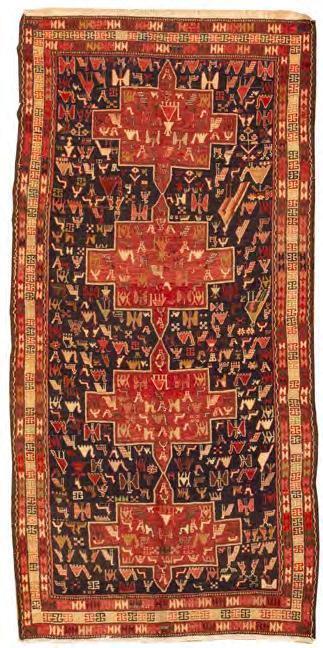 694. Persian Soumak Carpet, allover design of figures and animals, 4 ft. 6 in. x 9 ft. [$700/900]