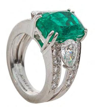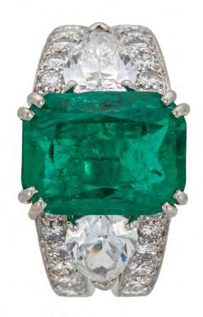 56. David Webb Platinum, Columbian Emerald and Diamond Ring, c. 1970, center emerald mixed cut emerald, wt. approx. 5.68 cts. (minor treatment); flanked by 2 pear and numerous round diamonds, total wt. approx. 2.00 cts.; size 5; 9.20 dwts. [$70,000/90,000]