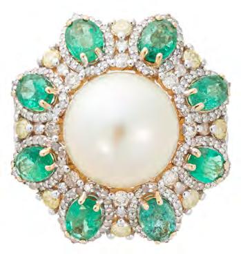 40. 14 kt. Yellow Gold, South Sea Pearl, Emerald and Diamond Ring, center round cultured south sea pearl, 11.20-11.30 mm; mounted with 8 oval mixed cut emeralds, total wt. approx. 1.98 cts.; and 266 round brilliant and round single cut diamonds; size 6.75; GGA report. [$2000/3000]