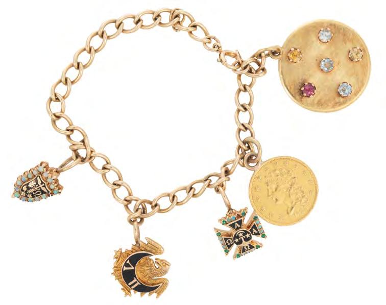 19. 14 kt. Yellow Gold Charm Bracelet, marked, mounted with 4 charms, l. 6 3/4 in.; 17.35 dwts. [$800/1200]