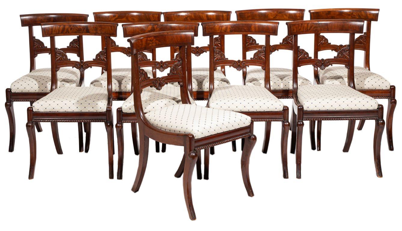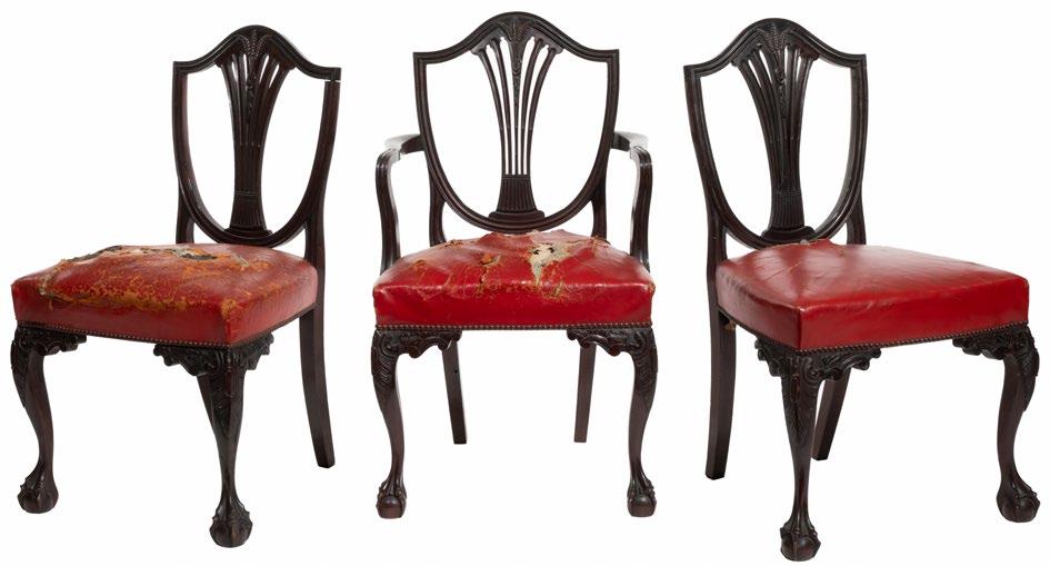 416. Set of Six Sheraton-Style Carved Mahogany Dining Chairs, 19th c., molded shield backs, cabriole legs, ball and claw feet, 38 x 18 x 21 in. (96.5 x 45.7 x 53.3 cm.), Frame: 39 x 22 x 21 in. (99.1 x 55.9 x 53.3 cm.) [$700 - 1,000]