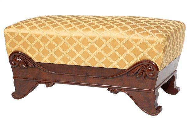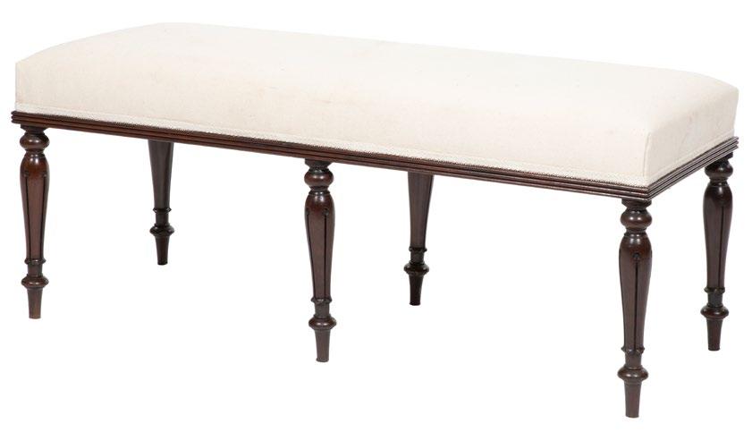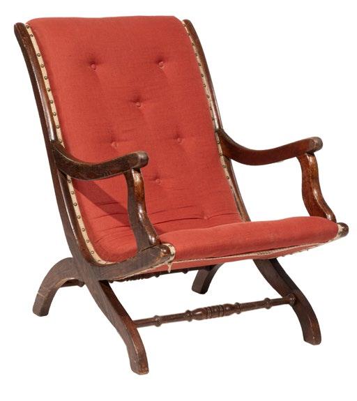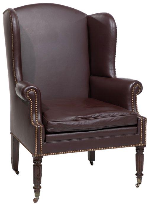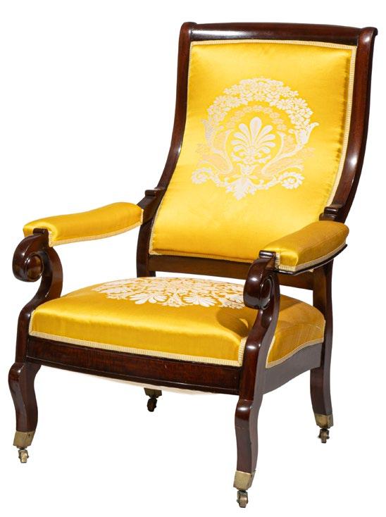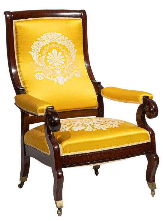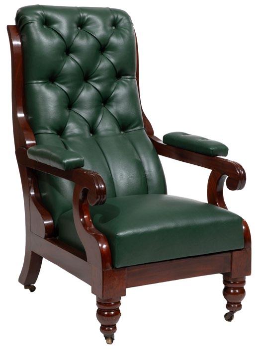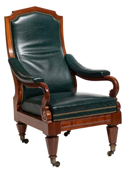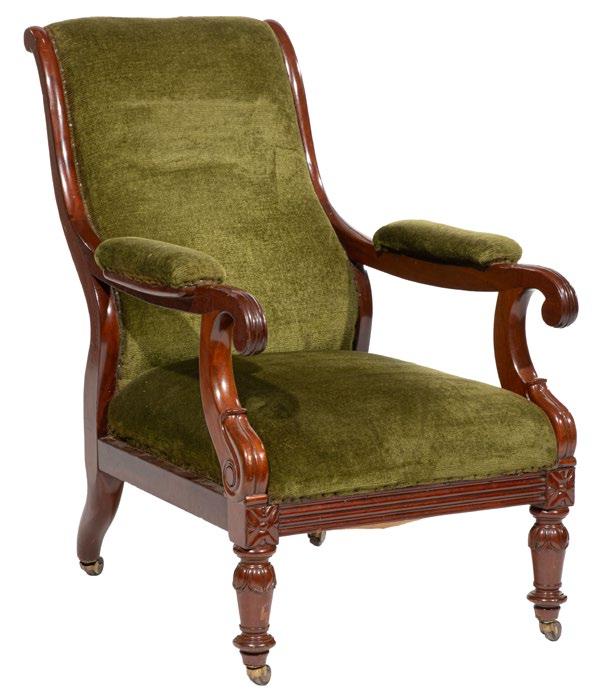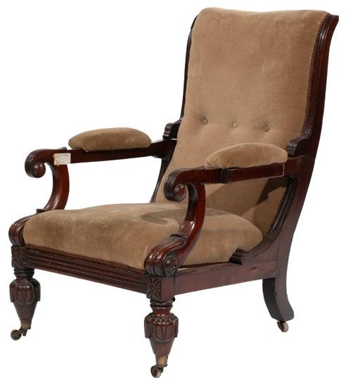 41. William IV Mahogany Reclining Library Chair, 19th c., possibly Scottish, scrolled rectangular back, padded scrolled arms, turned legs, castors, 40 x 24 1/2 x 27 1/2 in. (101.6 x 62.2 x 69.9 cm.)