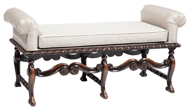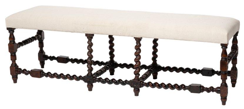 411. English Baroque-Style Carved Oak Barley Twist Bench, 19th c. and later, upholstered seat, turned twist carved supports and legs, 18 x 55 1/2 x 17 in. (45.7 x 141 x 43.2 cm.)