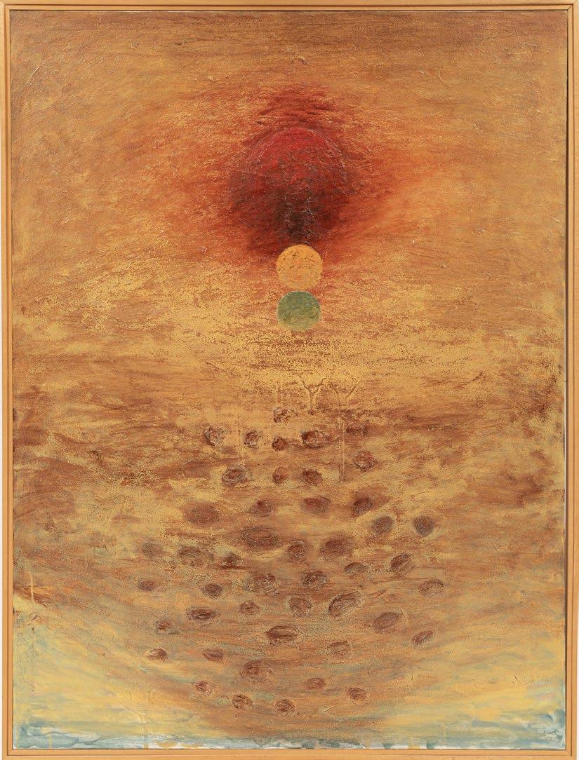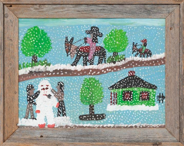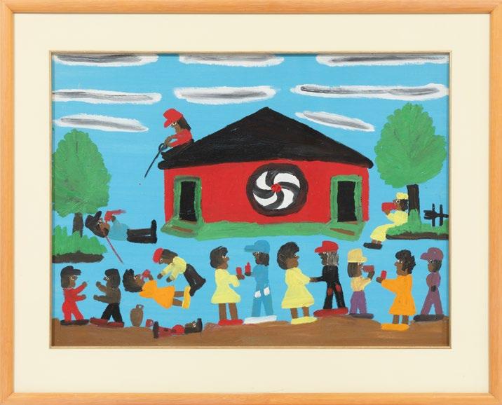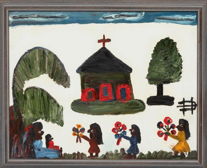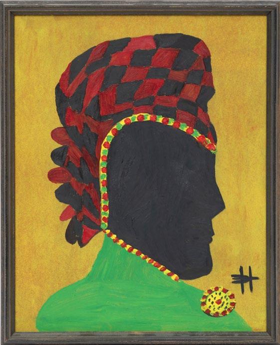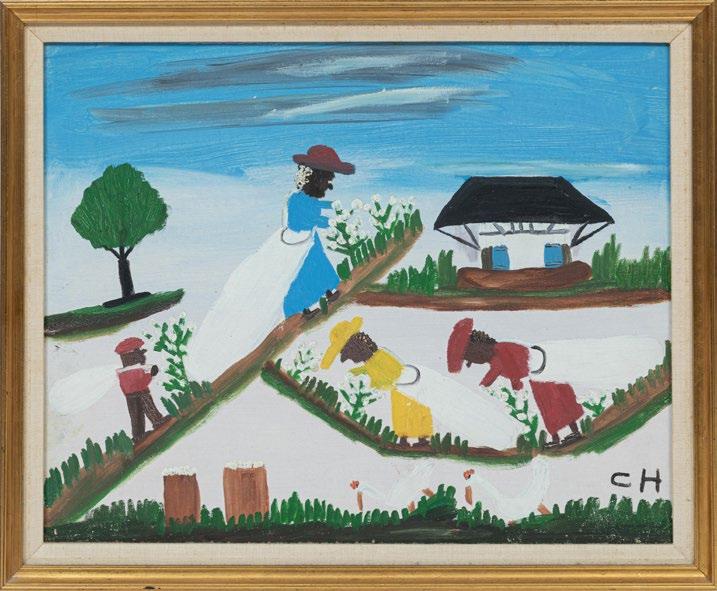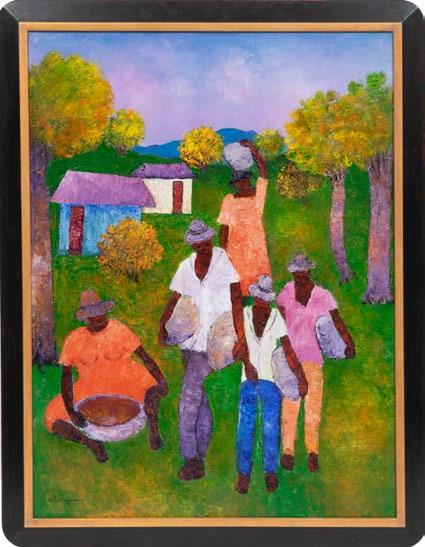 77. Henri Calixte, Haitian, 1933-2010, “Personnages dans un Paysage”, oil on canvas, signed lower left, “Page O’Connor Fine Arts, Miramar Beach, FL”, label and artist information sheet on backing paper, framed. 40 x 30 in. (101.6 x 76.2 cm.), Frame: 45 1/2 x 35 x 1 in. (115.6 x 88.9 x 2.5 cm.)
