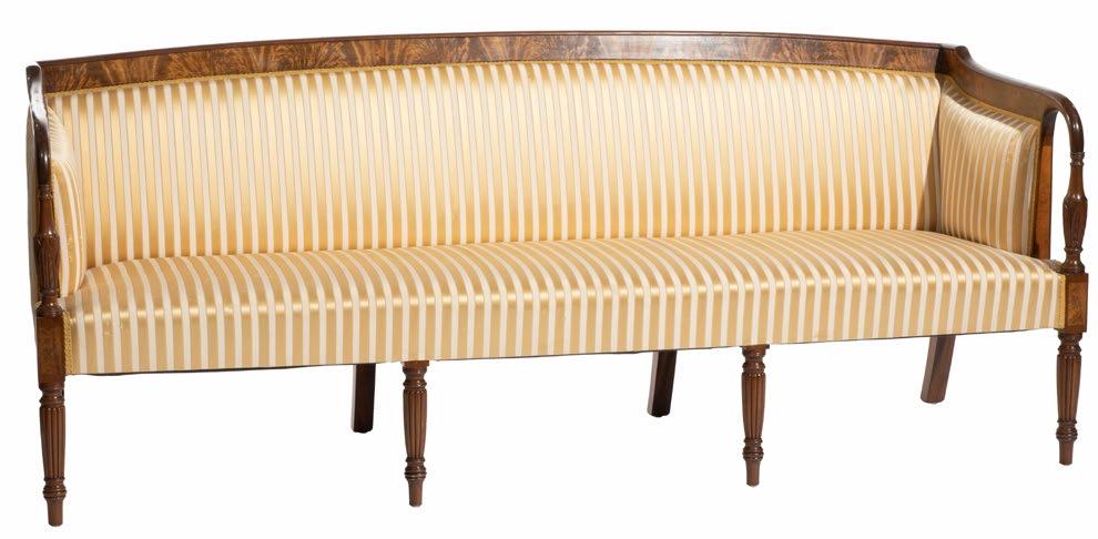 40. American Sheraton-Style Carved Mahogany Sofa, Late 19th c., molded arched crest rail, urn form supports, lobed tapered legs, 35 x 23 x 82 1/2 in. (88.9 x 58.4 x 209.6 cm.)