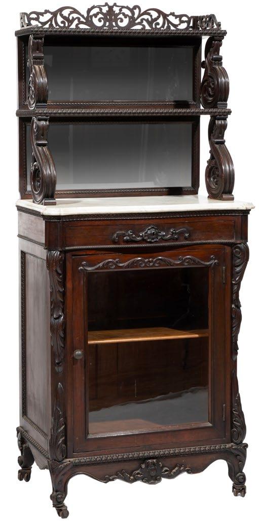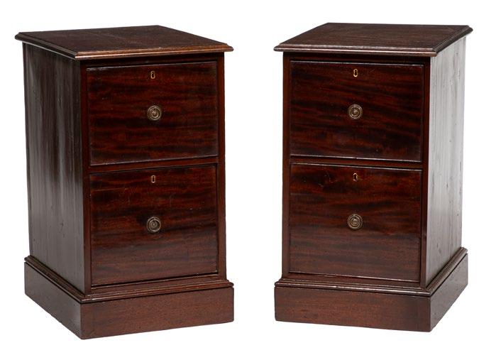 417. Pair of Regency-Style Carved Mahogany Pedestals, 19th c., molded lift tops, canted corners, curved doors, paw feet, 43 1/2 x 19 x 28 in. (110.5 x 48.3 x 71.1 cm.) [$1,000 - 1,500]